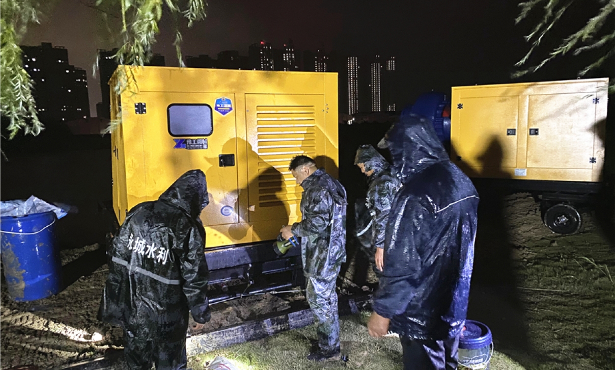 調(diào)試現(xiàn)場,突遭暴雨來襲,張工與技術(shù)人員堅守一線,從上午到晚上,從多云到暴雨,奮戰(zhàn)8小時,保證6臺防汛泵車正常工作,力爭設(shè)備第一時間執(zhí)行防汛救援任務(wù)。