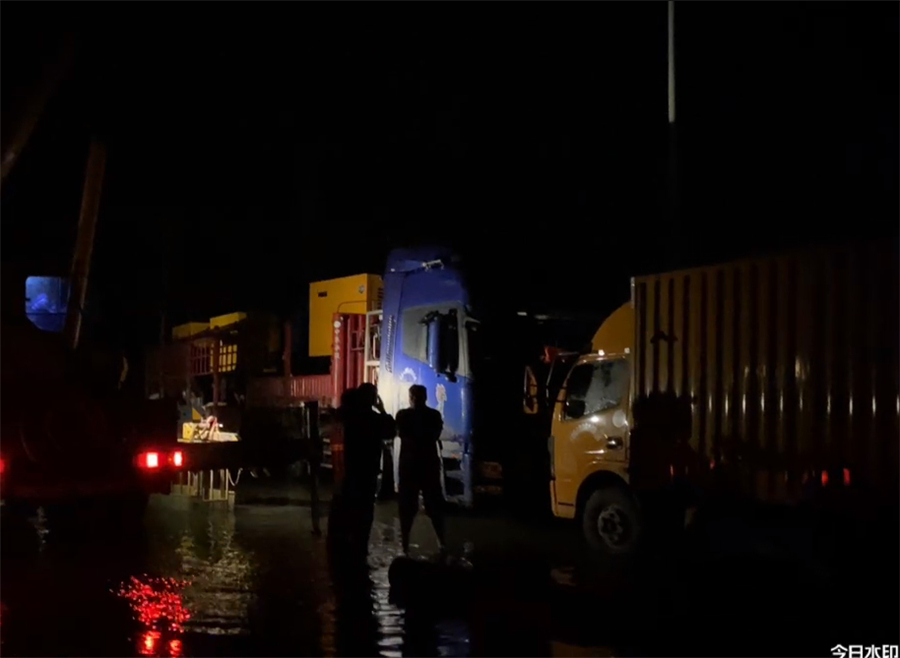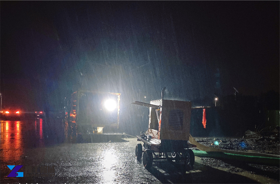 安裝調(diào)試一直持續(xù)到晚上,遭遇暴雨來襲,豫工技術(shù)員堅(jiān)守一線,與抗洪人員一道,全力以赴,通宵奮戰(zhàn),保證5臺防汛泵車全部投入工作,第一時(shí)間開始執(zhí)行防汛吸水任務(wù)!